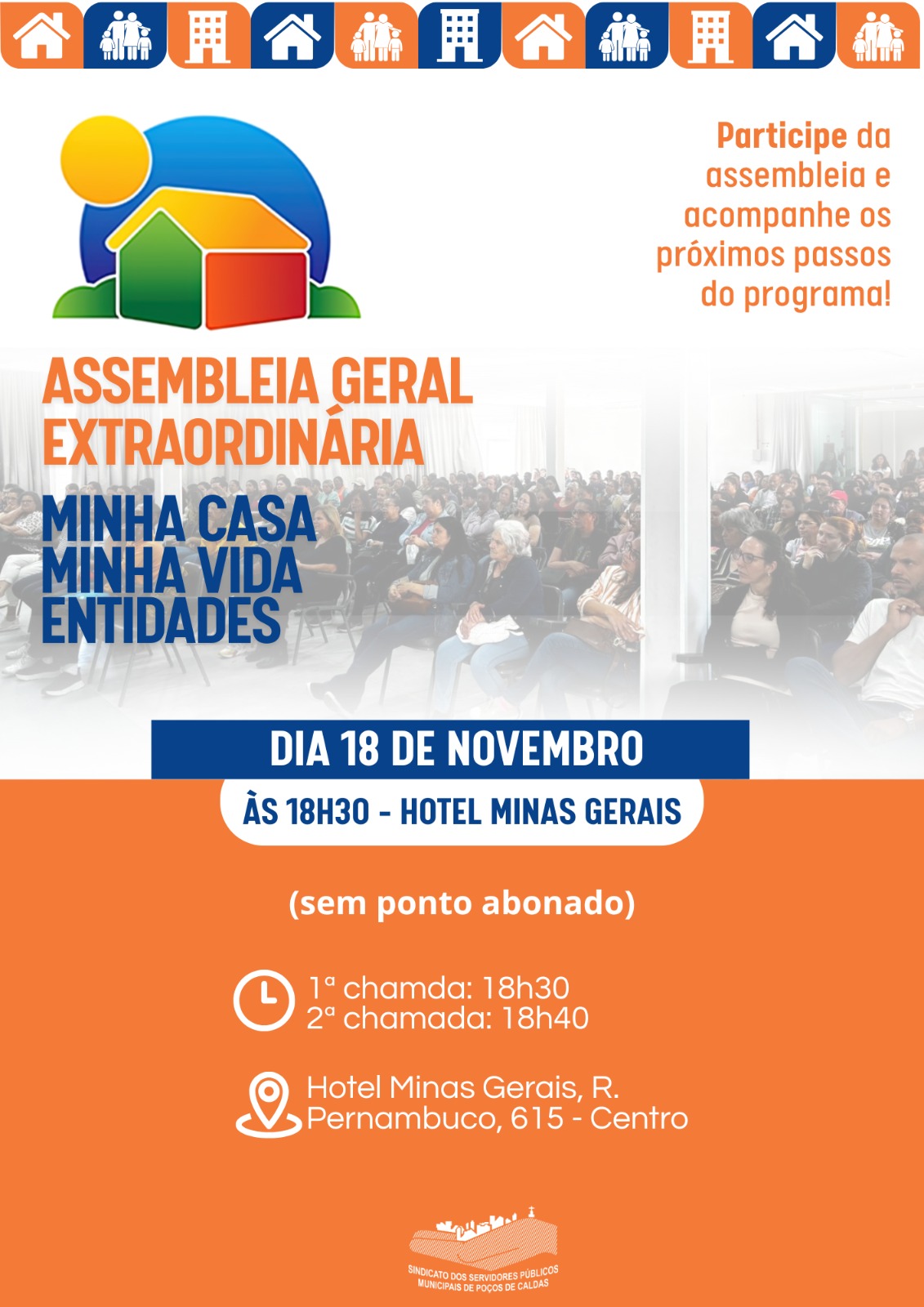 O Sindserv realiza no dia 18 de novembro a segunda assembleia sobre o programa Minha Casa, Minha Vida, voltada a pessoas com renda familiar de até R$ 2.850 e que não possuem casa própria — especialmente quem já fez a entrevista no Sindicato.